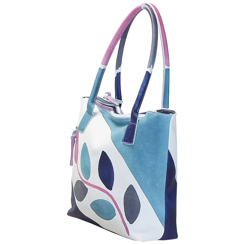 Natural leather handbag, handpainted. Shopper model with zip fastener, outside and inner pocket, practical and spacious, the inside divided into three compartments. It's suitable especially for informal occasions. All Acquerello handbags can be purchased with matching shoes, wallet, belt and other accessories. Colors grey, pink, light blue and blue and branch pattern.