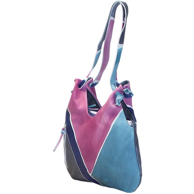 Natural leather handbag, handpainted, with shoulder strap, outside pocket, inside pocket. Lining inside. Ideal for free time and casual clothes, very comfy thanks to its flat shape, colored and lively it fits at any age. All Acquerello handbags can be purchased with matching shoes, wallet, belt and other accessories. Colors grey, pink, light blue and blue and geometrical pattern.