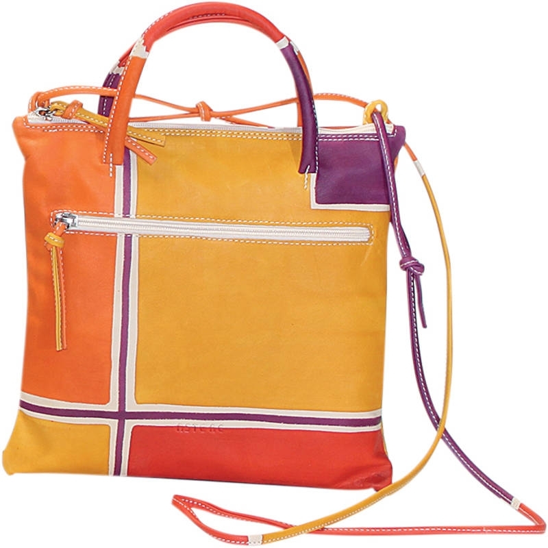 Natural leather across body bag, hand painted, with outside pocket, inside pocket and zip fastener, lining inside. Flat and comfortable, ideal for sport clothes and free time, colored and lively especially designed for young women. All Acquerello handbags can be purchased with matching shoes, wallet, belt and other accessories. Colors red, yellow, violet and orange and geometrical pattern.