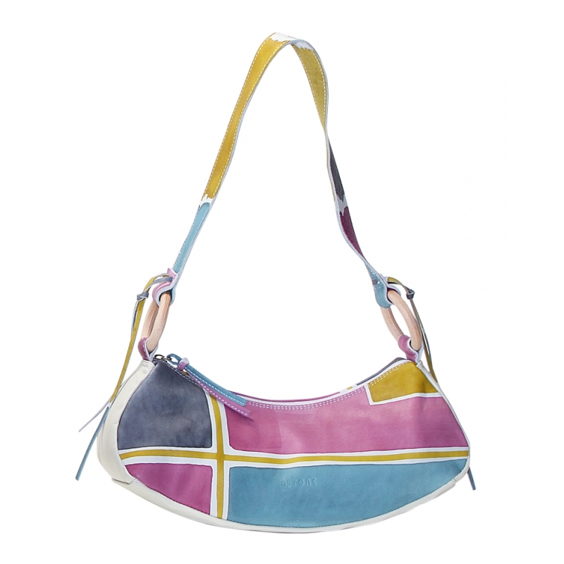 Natural leather handbag, handpainted, with wooden rings shoulder strap, inside pocket and zip fastener. Lining inside. Ideal for free time and casual clothes, colored and lively it fits at any age. All Acquerello handbags can be purchased with matching shoes, wallet, belt and other accessories. Colors pink, green, light blue and grey and geometrical pattern.