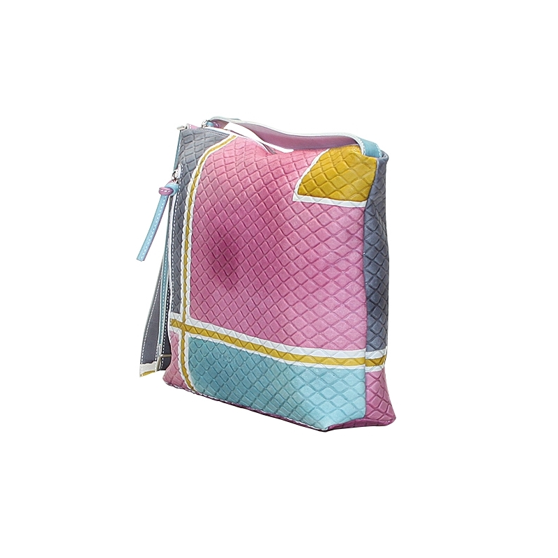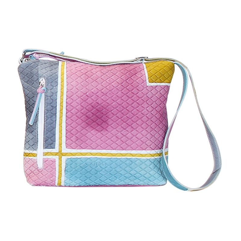 Natural leather across body bag, hand painted, with grata effect. This bag has an inside pocket and zip fastener, lining inside. Suitable for casual clothes and free time, ideal for young women. All Acquerello handbags can be purchased with matching shoes, wallet, belt and other accessories. Colors pink, green, light blue and grey and geometrical pattern.
