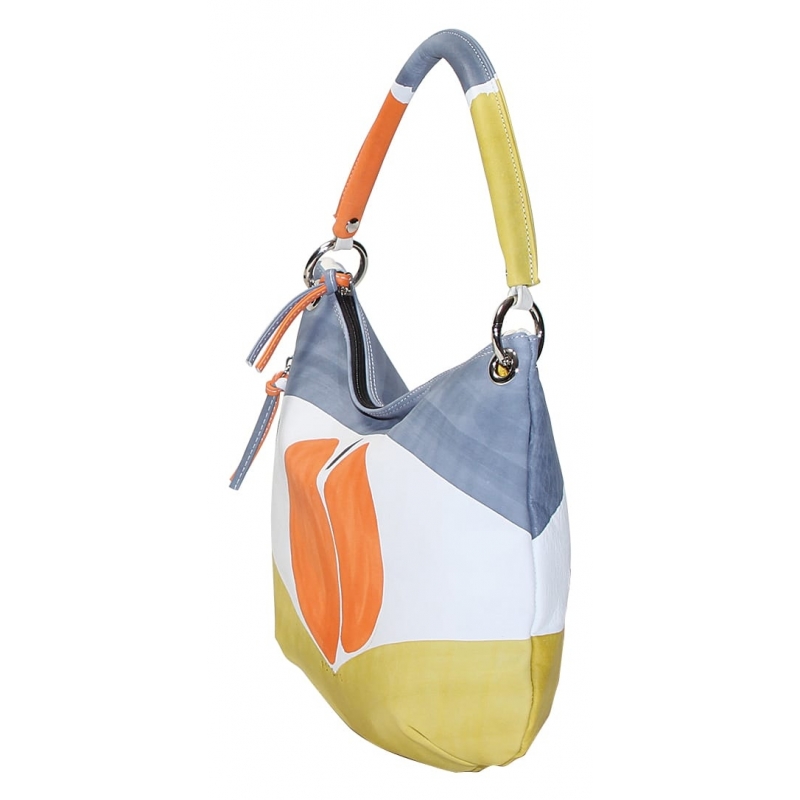 Natural leather handbag, handpainted. You can wear it also as across body bag thanks to its adjustable shoulder strap. With outside and inside pocket and lining inside. All Acquerello handbags can be purchased with matching shoes, wallet, belt and other accessories. Colors grey, orange, green and black and tulip pattern.