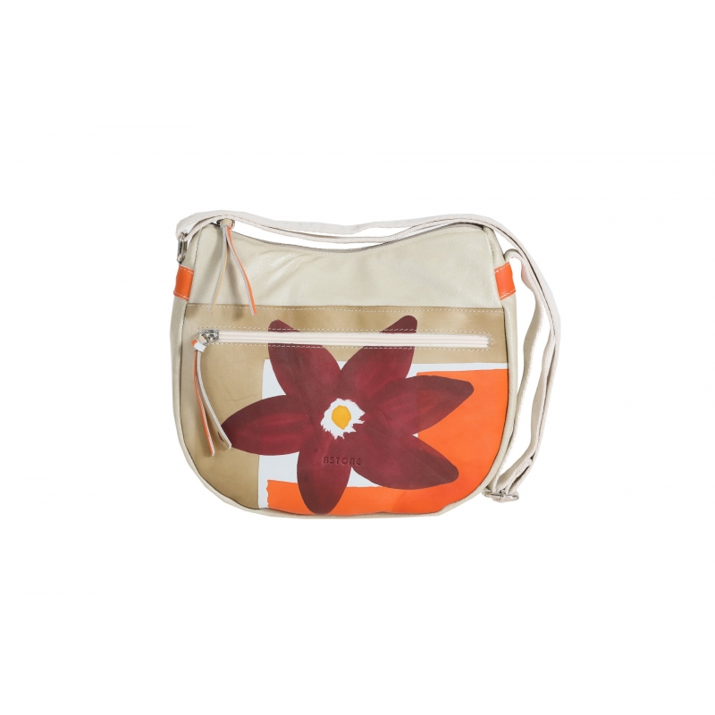Natural leather handbag, handpainted, with a pocket and lining inside. Soft shape, with external pocket and zip fastener, practical and spacious, it's suitable for any occasion. The shoulder strap is adjustable so that you can wear it as across body bag. All Acquerello handbags can be purchased with matching shoes, wallet, belt and other accessories. Colors orange, yellow, beige and dark violet and flower pattern.
