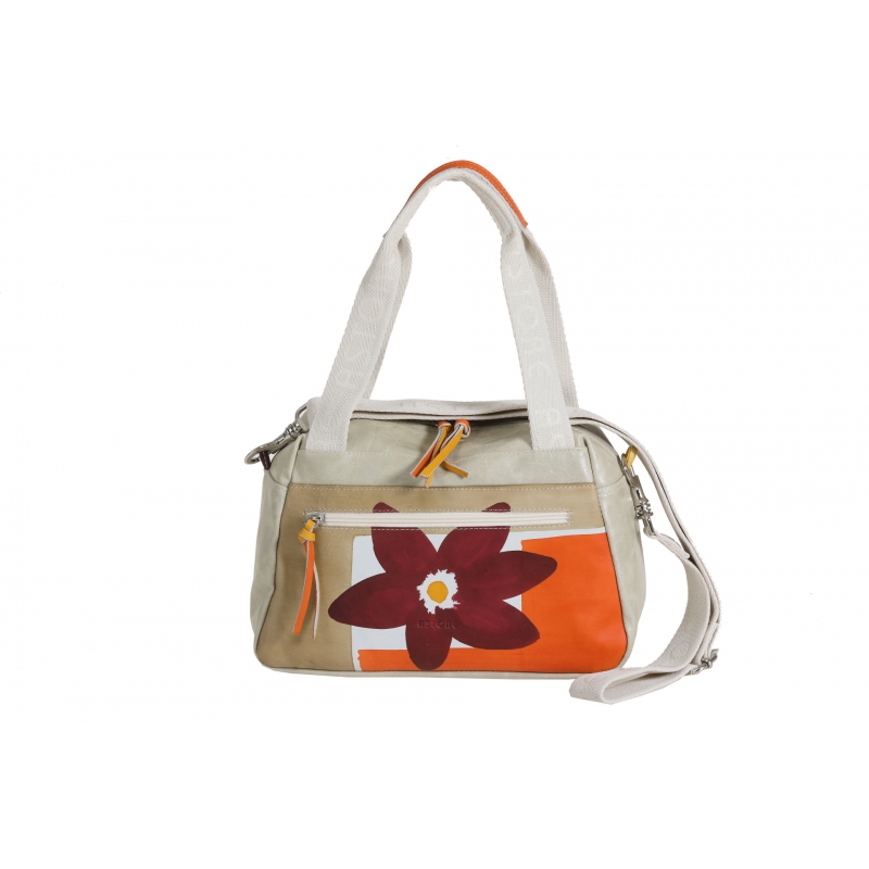 Natural leather handbag, handpainted, with external pocket, inner pocket and zip fastener, lining inside. The shoulder strap is adjustable so that you can wear it as across body bag. Colored and lively, it fits at any age. All Acquerello handbags can be purchased with matching shoes, wallet, belt and other accessories. Colors orange, yellow, beige and dark violet and flower pattern.