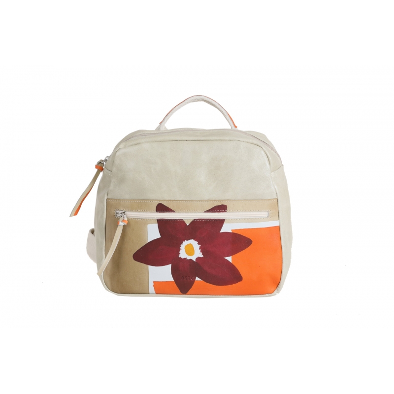 Leather backpack, handpainted. Practical and casual, it's especially suitable for free time. All handbags can be purchased with matching shoes, wallet, belt and other accessories. Colors orange, yellow, beige and dark violet and flower pattern.