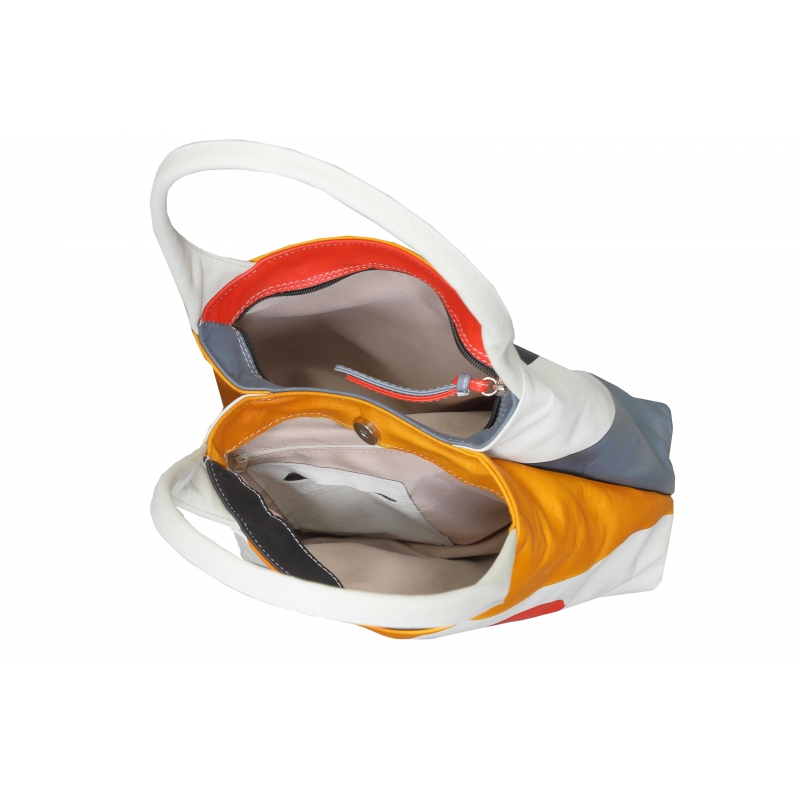 Natural leather handbag, handpainted. All Acquerello handbags can be purchased with matching shoes, wallet, belt and other accessories. Colors red, yellow, grey and black and branch pattern.