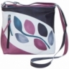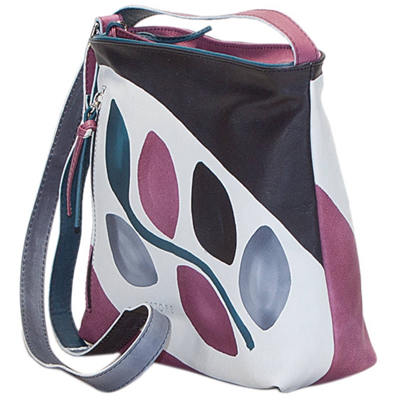 Natural leather across body bag, hand painted, flat and comfortable with outside pocket, inner pocket and zip fastener, lining inside. Ideal for sport clothes and free time. All Acquerello handbags can be purchased with matching shoes, wallet, belt and other accessories. Colors violet, black, blue and light blue and branch pattern.