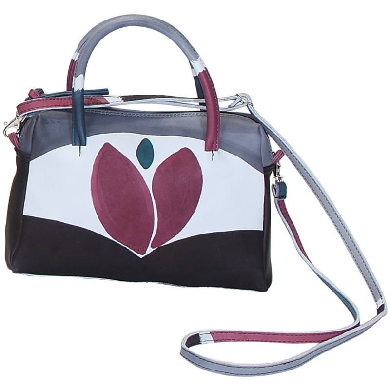 Natural leather handbag, handpainted, with inside pocket and lining inside. Small and comfortable, it can be worn also with the adjustable shoulder strap. Colored and lively, it fits at any age. All Acquerello handbags can be purchased with matching shoes, wallet, belt and other accessories. Colors violet, black, blue and light blue and tulip pattern.