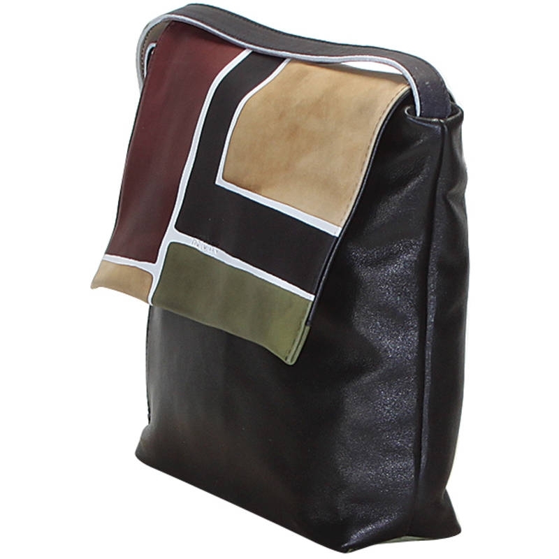 Natural leather across body bag, hand painted, with inside pocket and zip fastener, lining inside. Suitable for sport clothes and free time, ideal for young women. All Acquerello handbags can be purchased with matching shoes, wallet, belt and other accessories. Colors beige, green, black and brown and geometrical pattern.