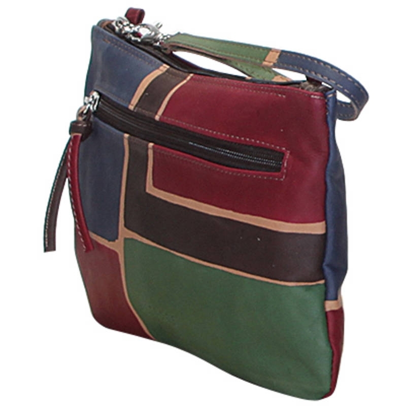 Natural leather purse, handpainted, also with shoulder strap. Ideal for free time and casual clothes, very comfy thanks to its flat shape, colored and lively it fits at any age. All Acquerello handbags can be purchased with matching shoes, wallet, belt and other accessories. Colors brown, green, red and blue and geometrical pattern.