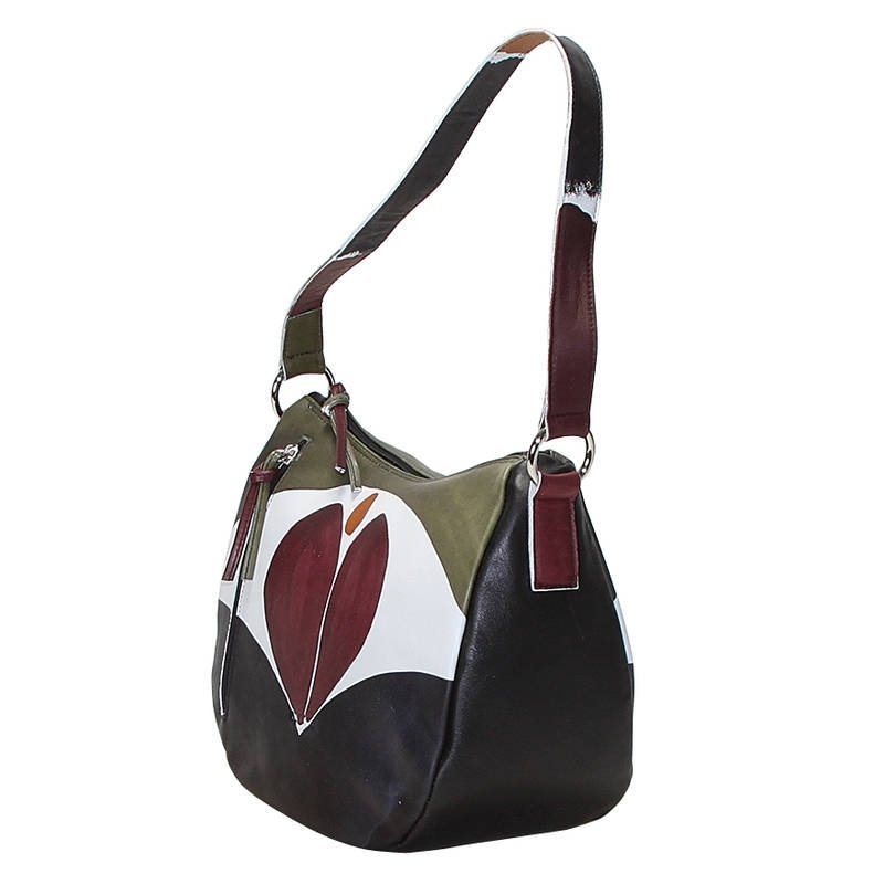 Natural leather handbag, handpainted, with wooden rings adjustable shoulder strap, outside pocket, inside pocket and zip fastener. Lining inside. Very capacious, the inside is divided into two compartments, and with a soft shape. Ideal for free time and casual clothes, colored and lively it fits at any age. All Acquerello handbags can be purchased with matching shoes, wallet, belt and other accessories. Colors black, green, yellow and bordeaux and tulip pattern.