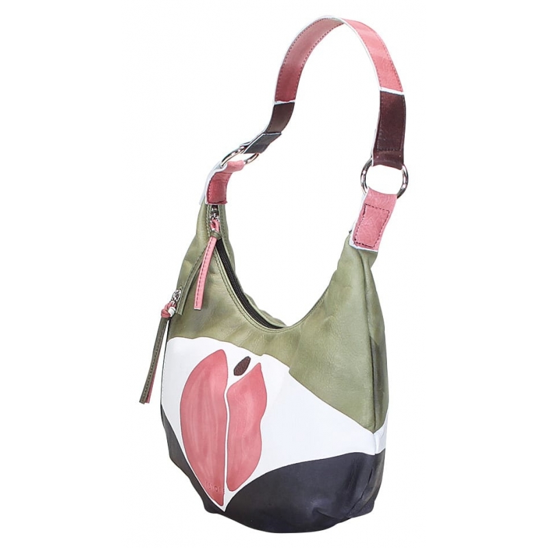 Natural leather handbag, handpainted, with a pocket and lining inside. Soft shape, with external pocket and zip fastener, practical and spacious, it's suitable for any occasion. All Acquerello handbags can be purchased with matching shoes, wallet, belt and other accessories. Colors pink, black, bordeaux and dark green and tulip pattern.