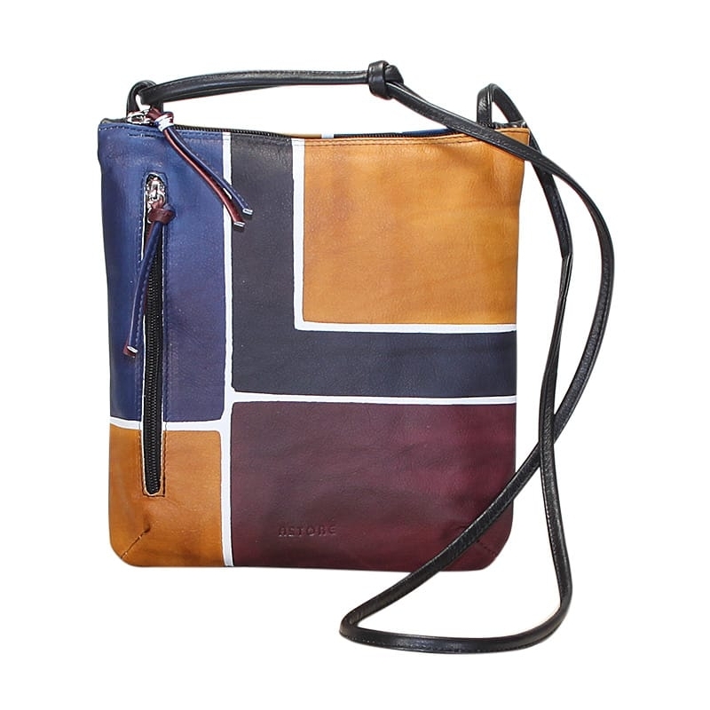 Natural leather across body bag, hand painted, with outside pocket, inside pocket and zip fastener, lining inside. Suitable for casual clothes and free time, ideal for young women. All Acquerello handbags can be purchased with matching shoes, wallet, belt and other accessories. Colors black, blue, yellow and bordeaux and geometrical pattern.