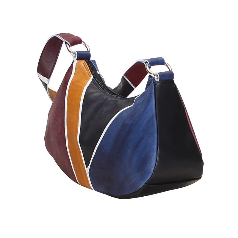 Natural leather handbag, handpainted, with shoulder strap, inside pocket and zip fastener. Lining inside. Ideal for free time and casual clothes, colored and lively it fits at any age. All Acquerello handbags can be purchased with matching shoes, wallet, belt and other accessories. Colors black, blue, yellow and bordeaux and geometrical pattern.