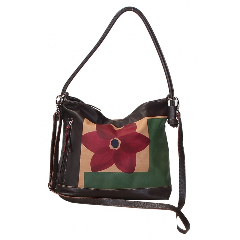 Natural leather handbag, handpainted, with multicolored adjustable shoulder strap, outside pocket, inside pocket and zip fastener. Lining inside. It's very capacious, it can be expanded on the bottom, and ideal for both free time and casual clothes, and for more formal situations, it fits at any age. It can be worn also as across body bag. It's possible to enlarge it thanks to the press studs on the bottom. All Acquerello handbags can be purchased with matching shoes, wallet, belt and other accessories. Colors brown, green, red and blue and flower pattern.