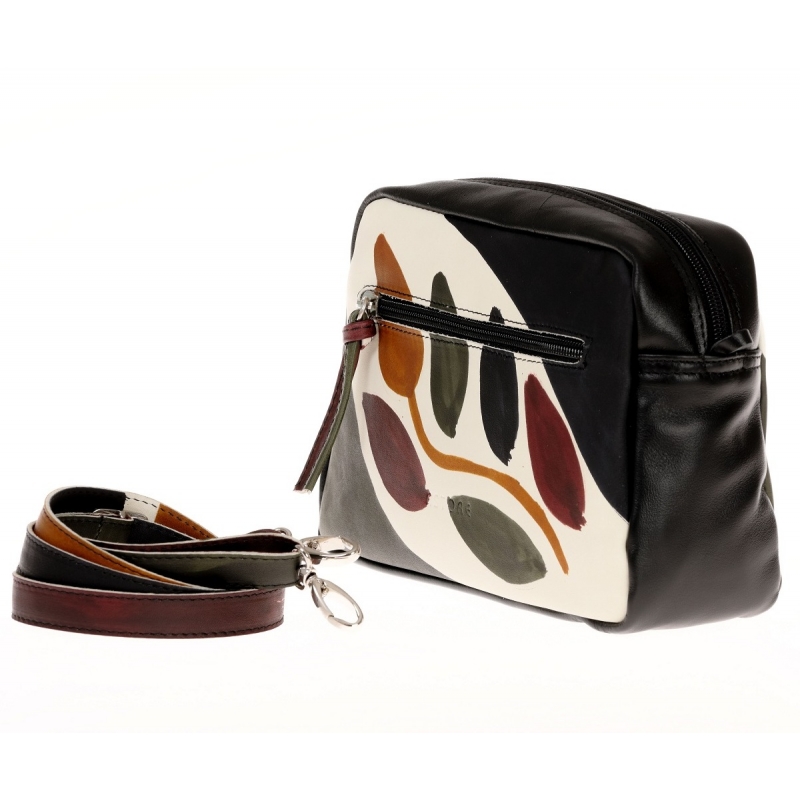Natural leather handbag, handpainted with external pocket, zip fastener and lining inside. Small and comfortable, it can be worn also with the adjustable shoulder strap. All Acquerello handbags can be purchased with matching shoes, wallet, belt and other accessories. Colors black, green, yellow and bordeaux and branch pattern.