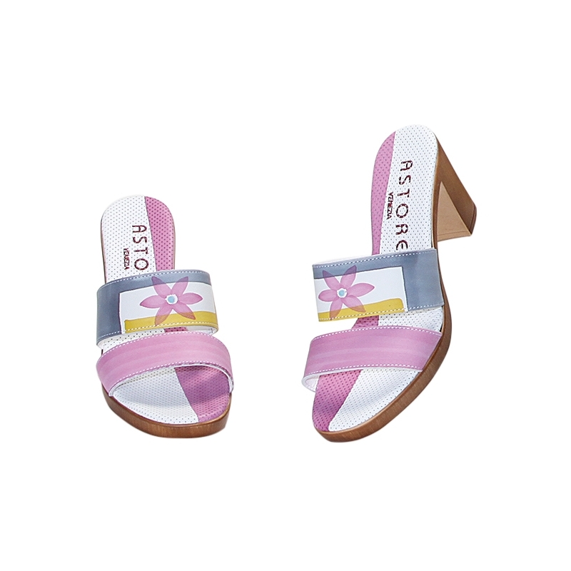 Natural leather sandals with ankles straps, hand painted. Ideal for casual clothes and free time. Match them to your Acquerello handbag! Colors pink, green, light blue and grey and flower pattern.