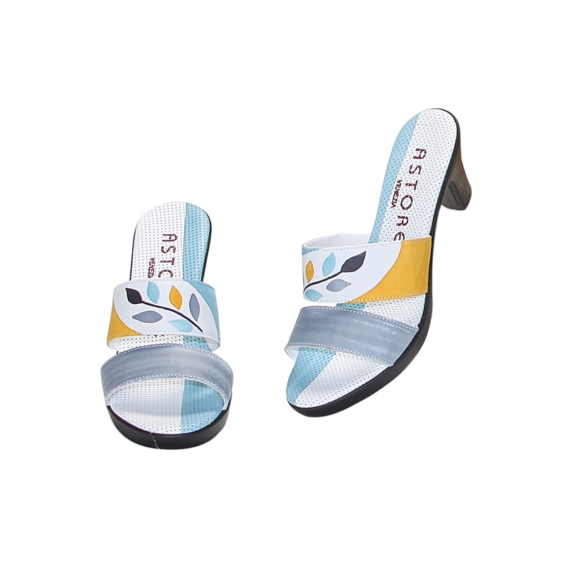 Natural leather sandals with open toe e flat heels, hand painted. Ideal for casual clothes and free time. Match them to your Acquerello handbag! Colors yellow, light blue, grey and black and branch pattern.