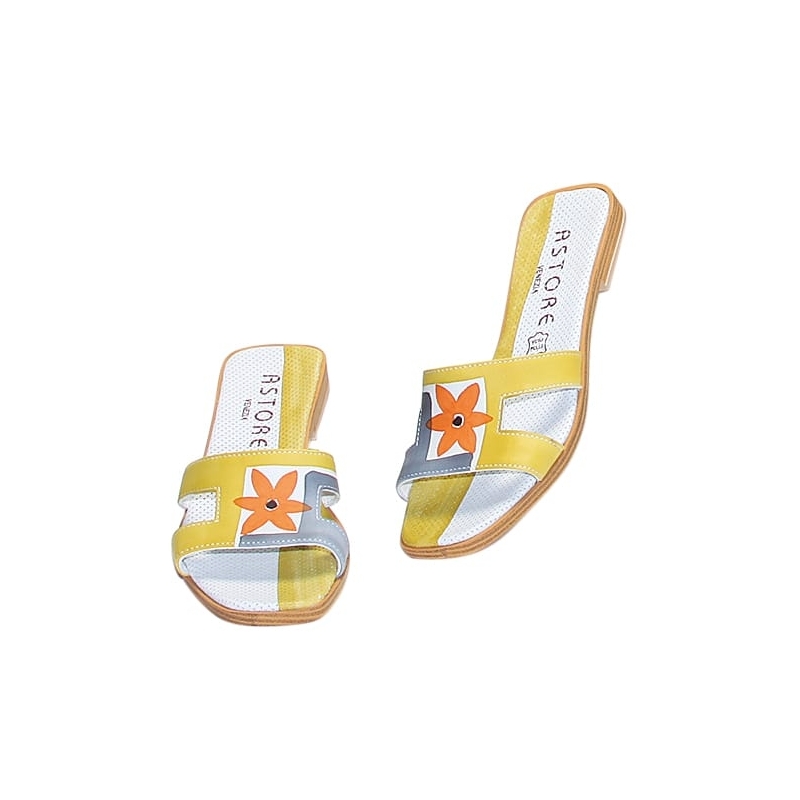 Natural leather mules, hand painted, with ankle straps. Ideal for casual clothes and free time. Match them to your Acquerello handbag! Colors grey, orange, green and black and flower pattern.