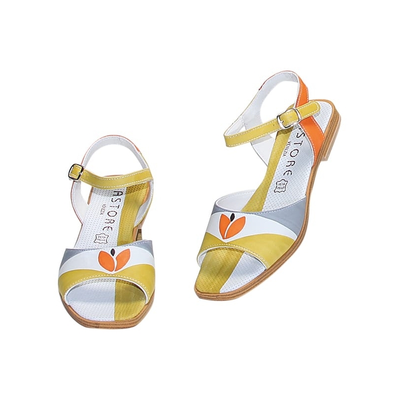 Natural leather sandals, hand painted, with ankle straps. Ideal for casual clothes and free time. Match them to your Acquerello handbag! Colors grey, orange, green and black and tulip pattern.
