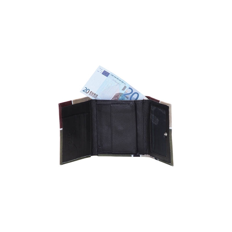 Natural leather wallet, handpainted. 1 compartment with coin purse, document and credit cards slots. Perfect idea for a present or simply match it to your Acquerello handbag. Colors black, purple, brown and yellow and geometrical pattern.