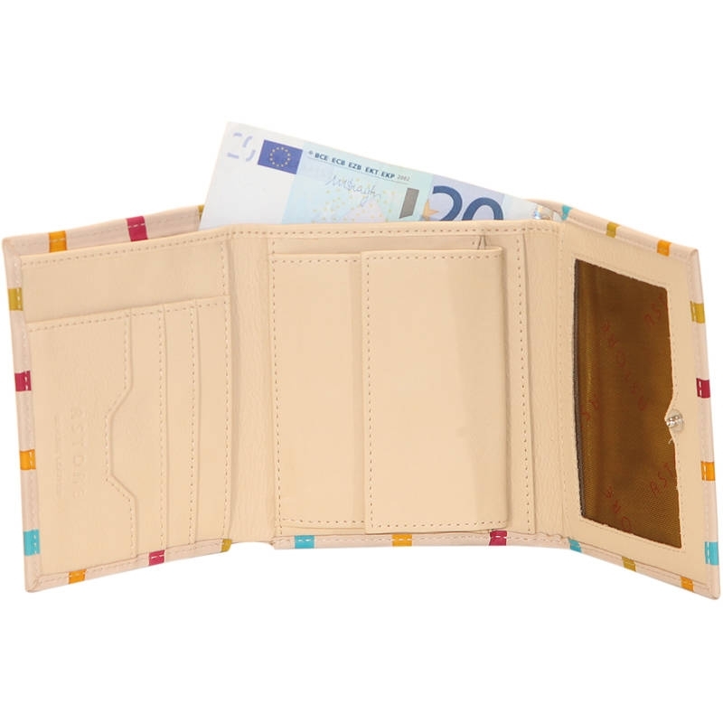 Natural leather wallet, handpainted. 1 compartment with coin purse, document and credit cards slots. Perfect idea for a present or simply match it to your Acquerello handbag. Colors orange, yellow, green and fuchsia and geometrical pattern.