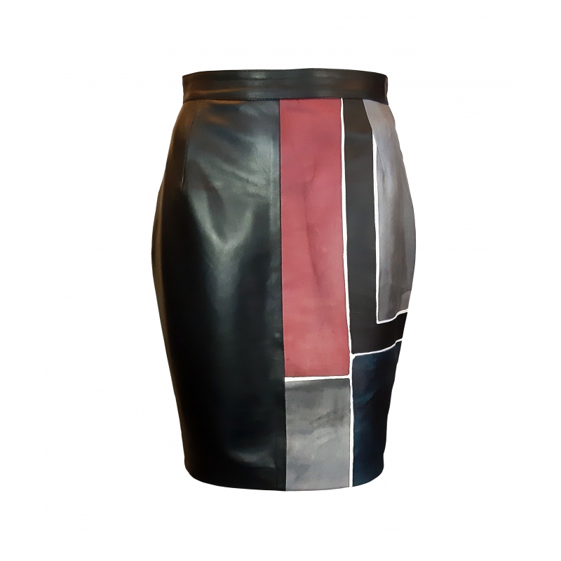 Gonna in pelle nera con inserto in pelle colorata dipinta a mano. La lunghezza della gonna è sopra al ginocchio. Presenta una chiusura a zip ed una sottogonna. Ottima sia per il tempo libero che per occasioni più formali. Tutti i prodotti della linea Acquerello possono essere acquistati con borse, scarpe e altri accessori coordinati. Colori nero, grigio, blu e viola e motivo geometrico.