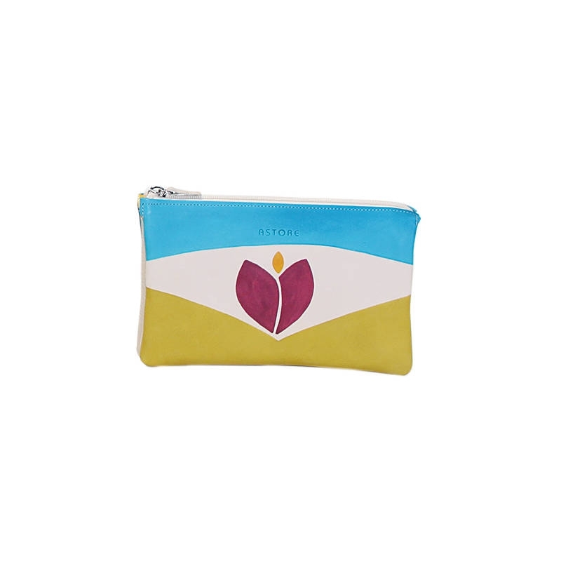 Bustina colorata in pelle dipinta a mano. 2 scomparti e un anello per chiavi all'interno. Ottima come idea regalo o da abbinare alla tua borsa e portafoglio Acquerello. Colore fucsia, verde, giallo e azzurro e motivo tulipano.