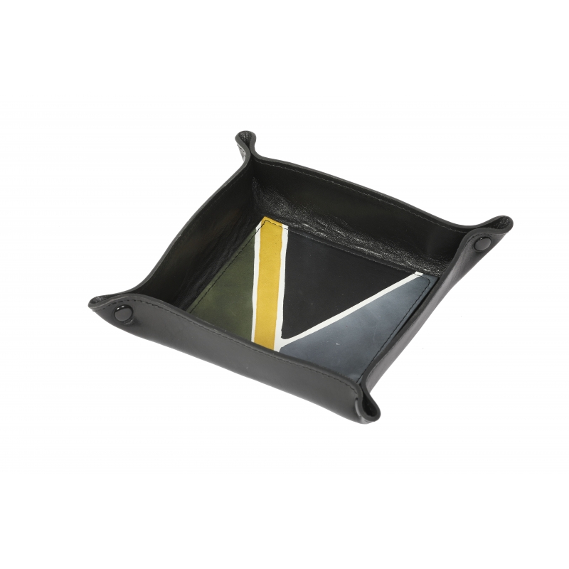 Svuotatasche realizzato in pelle dipinta a mano. Accessorio pratico e funzionale per la casa o per l'ufficio, ottimo come idea regalo sia per donna sia per uomo. Colori grigio, verde, nero e giallo e motivo geometrico.