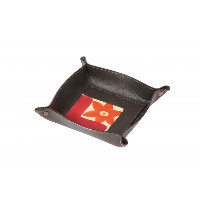 Svuotatasche realizzato in pelle dipinta a mano. Accessorio pratico e funzionale per la casa o per l'ufficio, ottimo come idea regalo sia per donna sia per uomo. Colore marrone, arancio, giallo e rosso e motivo floreale.