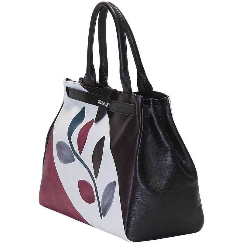 Borsa in pelle dipinta a mano, può essere indossata sia con manici che con tracolla. All'interno è divisa in due sezioni e la chiusura è con automatico. La forma è classica e ne permette l'utilizzo anche nelle occasioni più formali, senza rinuciare alla vivacità e all'allegria dei colori e delle figure. Tutte le borse della linea Acquerello possono essere acquistate in coordinato con scarpe, portafogli, cinture e altri accessori. Colore viola azzurro blu e nero e motivo ramo.