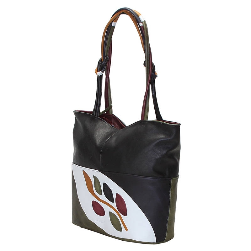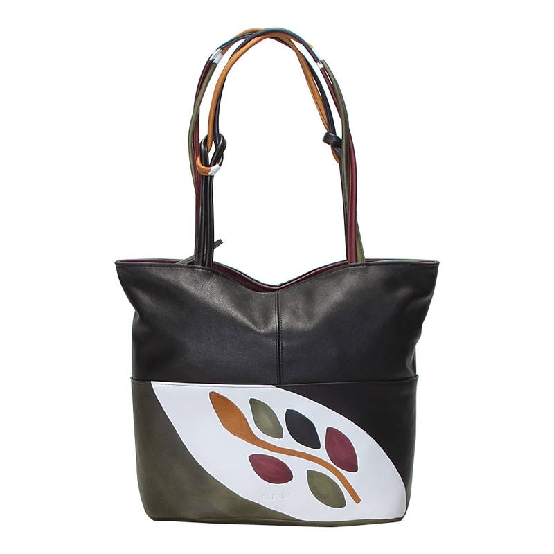 Borsa colorata in pelle dipinta a mano, foderata internamente. Modello shopper con tracolla intrecciata e chiusura zip, tasca interna, pratica e capiente, adatta per occasioni informali. Tutte le borse della linea Acquerello possono essere acquistate in coordinato con scarpe, portafogli, cinture e altri accessori. Colore nero, verde, giallo e bordeaux e motivo ramo.
