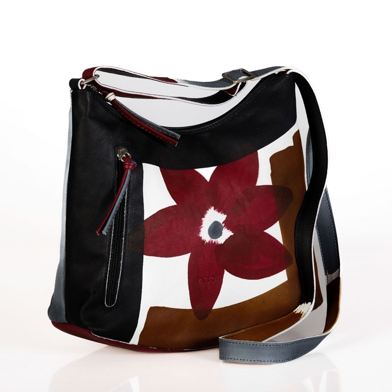 Borsa colorata in pelle dipinta a mano, con tasca interna e foderata internamente. Forma morbida, con tasca esterna e chiusura zip, pratica e capiente, adatta per tutte le occasioni. Tracolla regolabile, può essere indossata anche come borsa tracolla. Tutte le borse della linea Acquerello possono essere acquistate in coordinato con scarpe, portafogli, cinture e altri accessori. Colori rubino, grigio, nero e ocra e motivo tulipano.