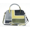 Borsa in pelle dipinta a mano con tasca interna e foderata internamente. Piccola e pratica, può essere indossata anche con la comoda tracolla regolabile. Colorata e allegra, è adatta a tutte le età. Tutte le borse della linea Acquerello possono essere acquistate in coordinato con scarpe, portafogli, cinture e altri accessori. Colori grigio, verde, nero e giallo e motivo geometrico.