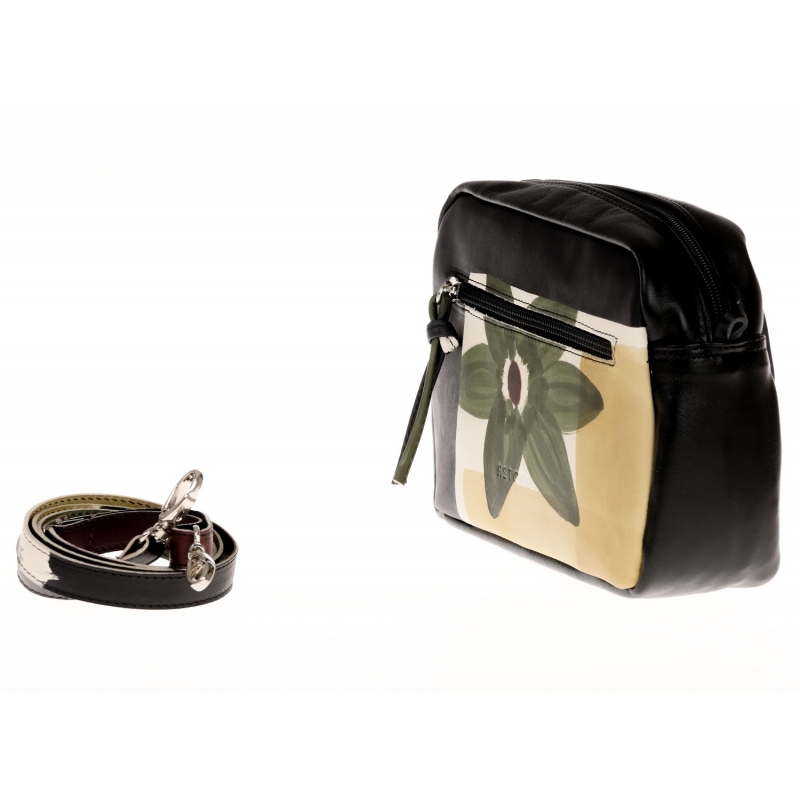 Borsa in pelle dipinta a mano con tasca esterna, chiusura zip e foderata internamente. Piccola e pratica, può essere indossata anche con la comoda tracolla regolabile. Tutte le borse della linea Acquerello possono essere acquistate in coordinato con scarpe, portafogli, cinture e altri accessori. Colore nero, verde, beige e marrone e motivo floreale.