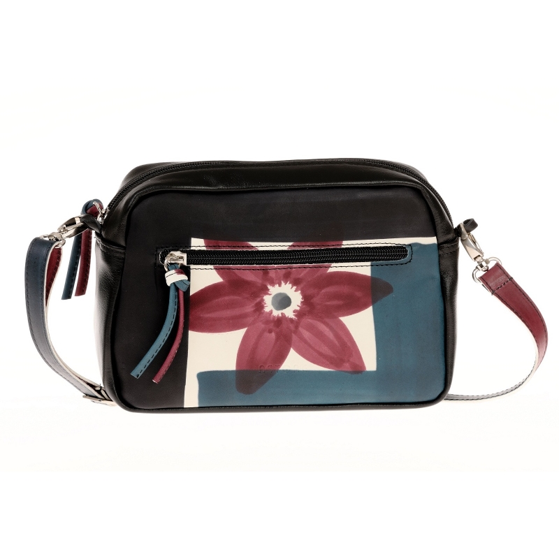 Borsa in pelle dipinta a mano con tasca esterna, chiusura zip e foderata internamente. Piccola e pratica, può essere indossata anche con la comoda tracolla regolabile. Tutte le borse della linea Acquerello possono essere acquistate in coordinato con scarpe, portafogli, cinture e altri accessori. Colori viola, grigio, blu e nero e motivo floreale.