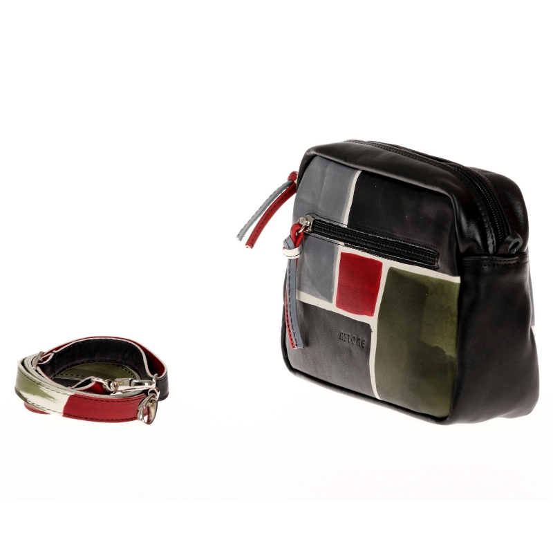 Borsa in pelle dipinta a mano con tasca esterna, chiusura zip e foderata internamente. Piccola e pratica, può essere indossata anche con la comoda tracolla regolabile. Tutte le borse della linea Acquerello possono essere acquistate in coordinato con scarpe, portafogli, cinture e altri accessori. Colore nero, rosso, azzurro e verde e motivo geometrico.