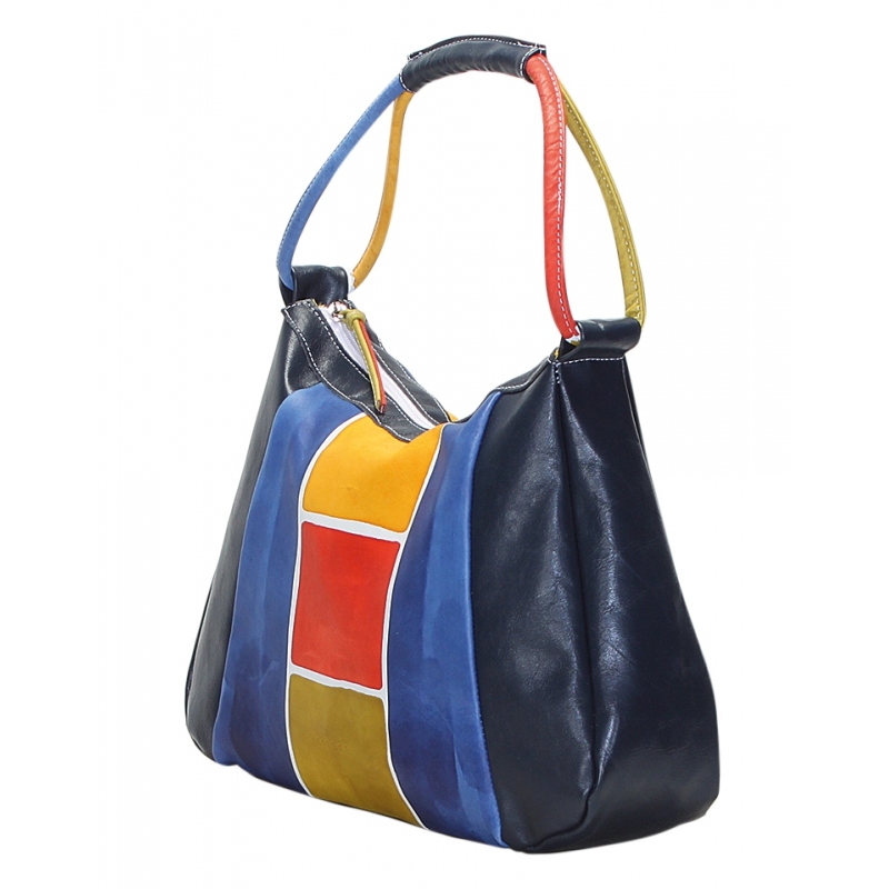 Borsa colorata in pelle dipinta a mano. Forma morbida, tasca interna e chiusura zip, foderata internamente, pratica e capiente, adatta per tutte le occasioni. Tutte le borse della linea Acquerello possono essere acquistate in coordinato con scarpe, portafogli, cinture e altri accessori. Colore blu, rosso, giallo e verde e motivo geometrico.