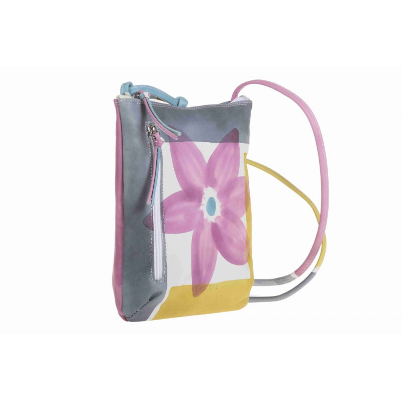 Borsa tracolla in pelle dipinta a mano con tasca esterna, tasca interna e chiusura zip, foderata internamente. Sottile e pratica da utilizzare. Adatta per il tempo libero e l'abbigliamento casual, colorata e allegra è l'ideale per le ragazze più giovani. Tutte le borse della linea Acquerello possono essere acquistate in coordinato con scarpe, portafogli, cinture e altri accessori. Colore rosa, verde, azzurro e grigio e motivo floreale.