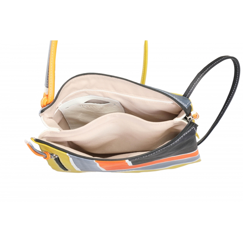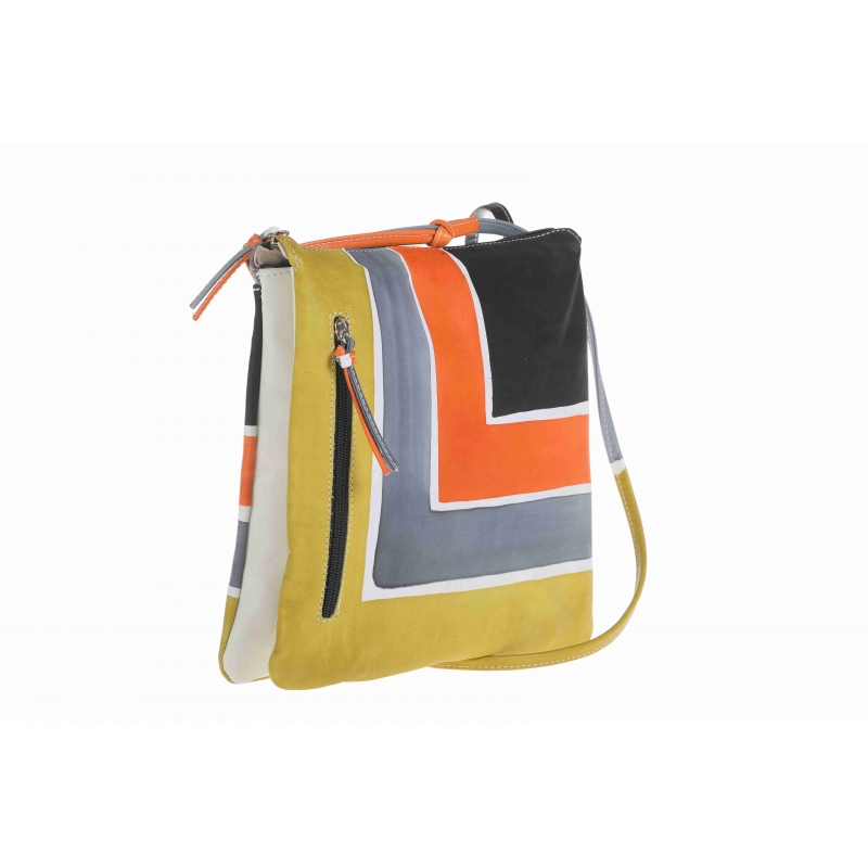 Borsa tracolla in pelle dipinta a mano con tasca esterna, tasca interna e chiusura zip. Foderata internamente. Sottile e pratica da utilizzare con interno diviso in due sezioni. Adatta per il tempo libero e l'abbigliamento sportivo, colorata e allegra adatta per tutte le età. Tutte le borse della linea Acquerello possono essere acquistate in coordinato con scarpe, portafogli, cinture e altri accessori. Colori grigio, arancione, verde e nero e motivo geometrico.