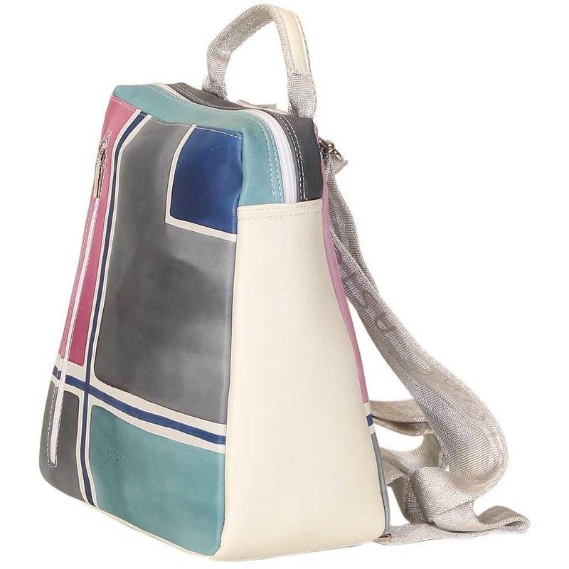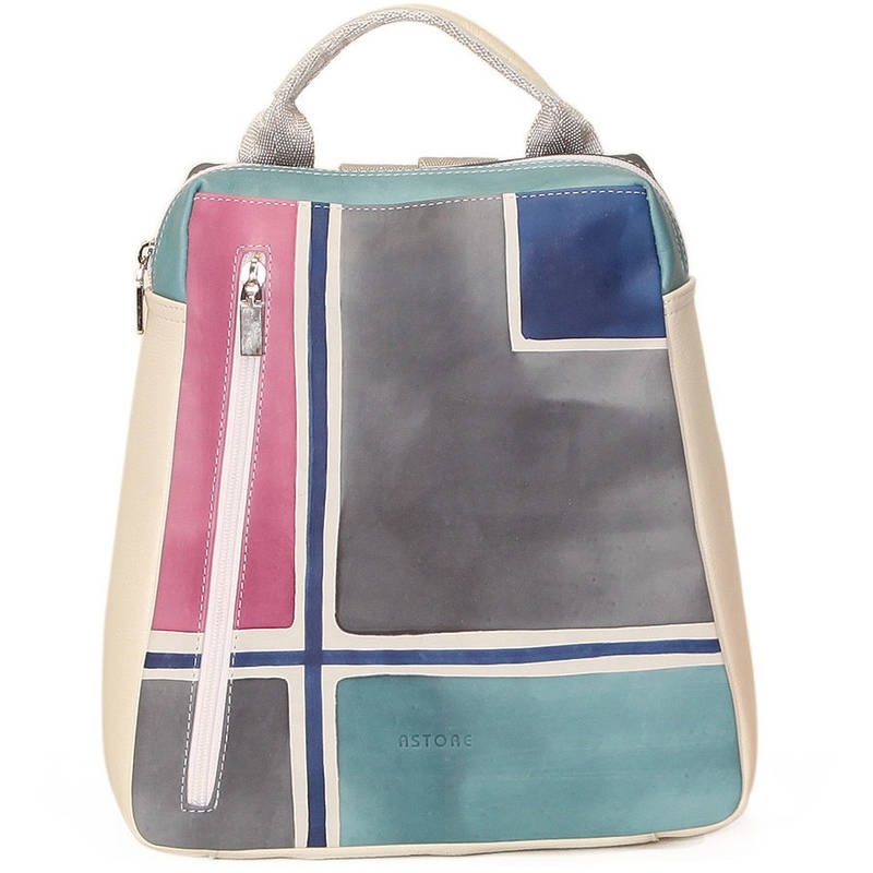 Zaino unisex in pelle dipinta a mano. Pratico e sportivo, adatta soprattutto per uomo. Tutte le borse della linea possono essere acquistate in coordinato con scarpe, portafogli, cinture e altri accessori. Colore grigio verde azzurro e viola scuro e motivo geometrico.