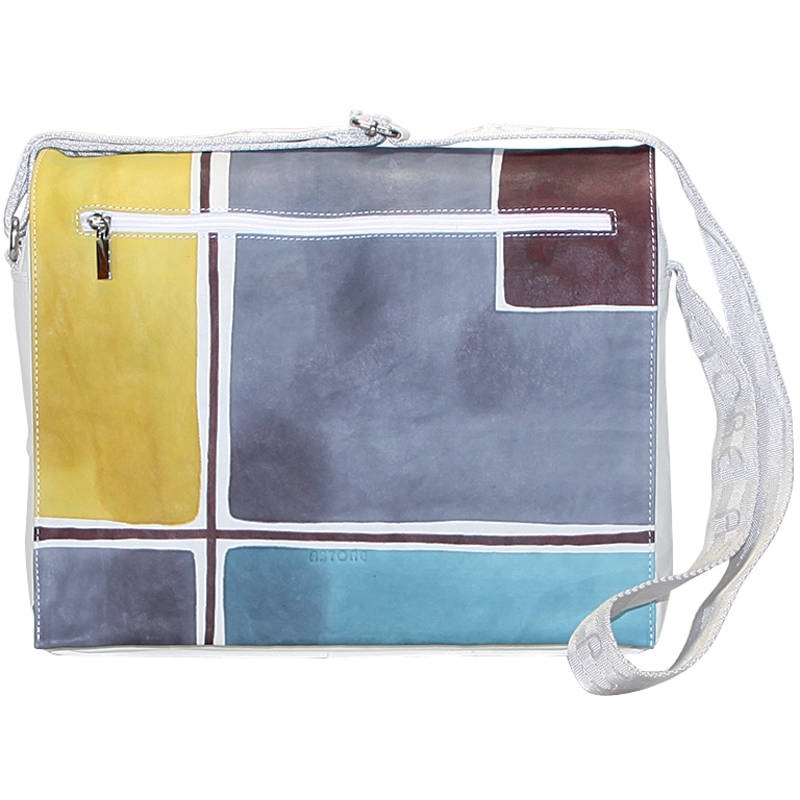Borsa unisex in pelle dipinta a mano. Comoda e capiente, ideale per occasioni informali. Tutte le borse della linea Business possono essere acquistate in coordinato con scarpe, portafogli, cinture e altri accessori. Colore grigio, verde, azzurro e viola scuro e motivo geometrico.