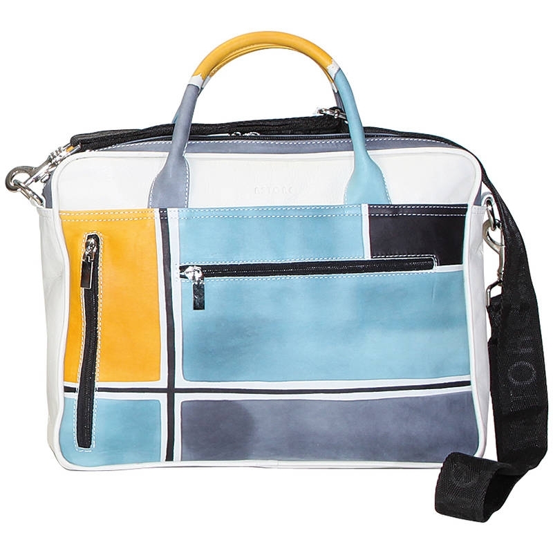 Borsa unisex in pelle dipinta a mano. Comoda e capiente può essere indossata con tracolla oppure utilizzando i manici corti. Tutte le borse della linea Business possono essere acquistate in coordinato con scarpe, portafogli, cinture e altri accessori. Colore giallo, azzurro, grigio e nero e motivo geometrico.