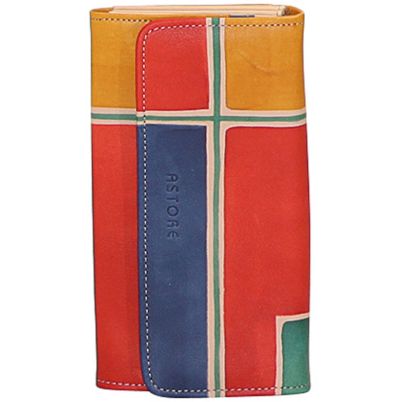 Portafoglio colorato in pelle dipinta a mano. Vari scomparti con porta monete, porta documenti e porta carte di credito. Ottimo come idea regalo o da abbinare alla tua borsa Acquerello. Colore giallo, verde, blu e rosso e motivo geometrico.