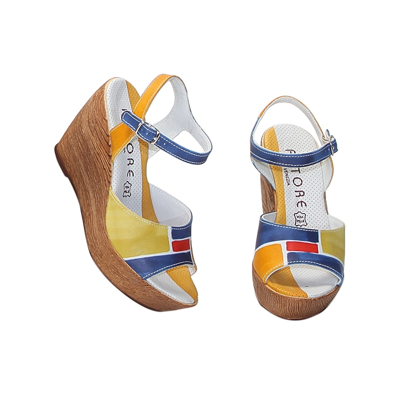 Sandali colorati in pelle dipinta a mano con zeppa e cinghietta alla caviglia. Ideali con un abbigliamento casual, ottimi per il tempo libero. Da abbinare alla tua borsa Acquerello! Colore blu, rosso, giallo e verde e motivo geometrico.