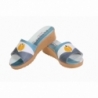 Sandali colorati in pelle dipinta a mano con zeppa e cinghietta alla caviglia. Ideali con un abbigliamento casual, ottimi per il tempo libero. Da abbinare alla tua borsa Acquerello! Colore giallo, azzurro, grigio e nero e motivo tulipano.