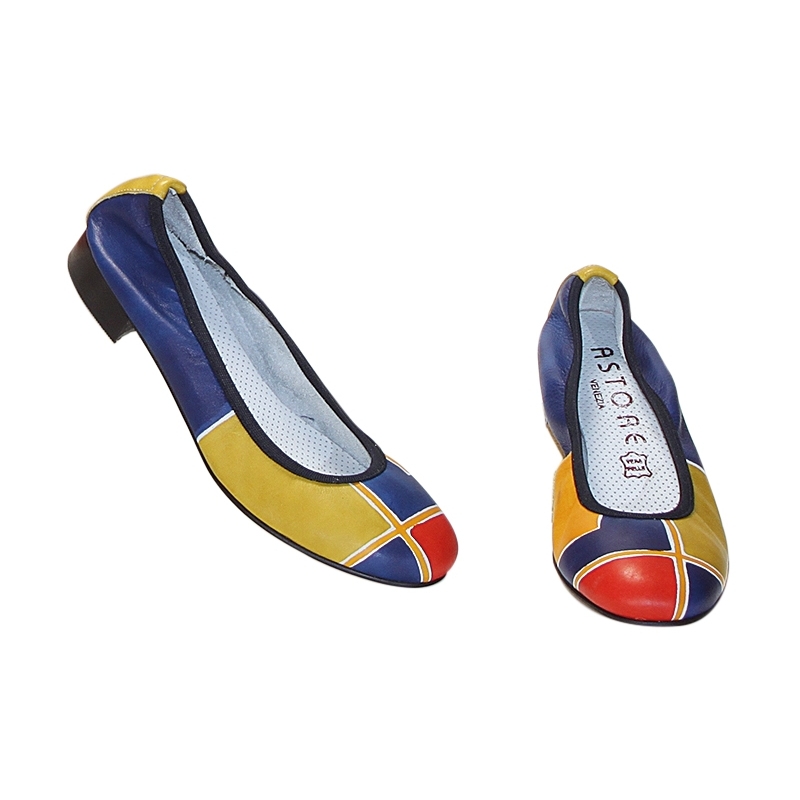 Scarpe ballerine colorate in pelle dipinta a mano. Ideali con un abbigliamento sportivo, ottime per il tempo libero. Da abbinare alla tua borsa Acquerello! Colore blu, rosso, giallo e verde e motivo geometrico.
