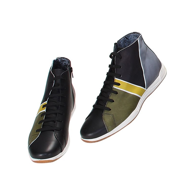 Sneakers colorate in pelle dipinta a mano. Ideali con un abbigliamento sportivo, ottime per il tempo libero. Da abbinare alla tua borsa Acquerello! Colori grigio, verde, nero e giallo e motivo geometrico.
