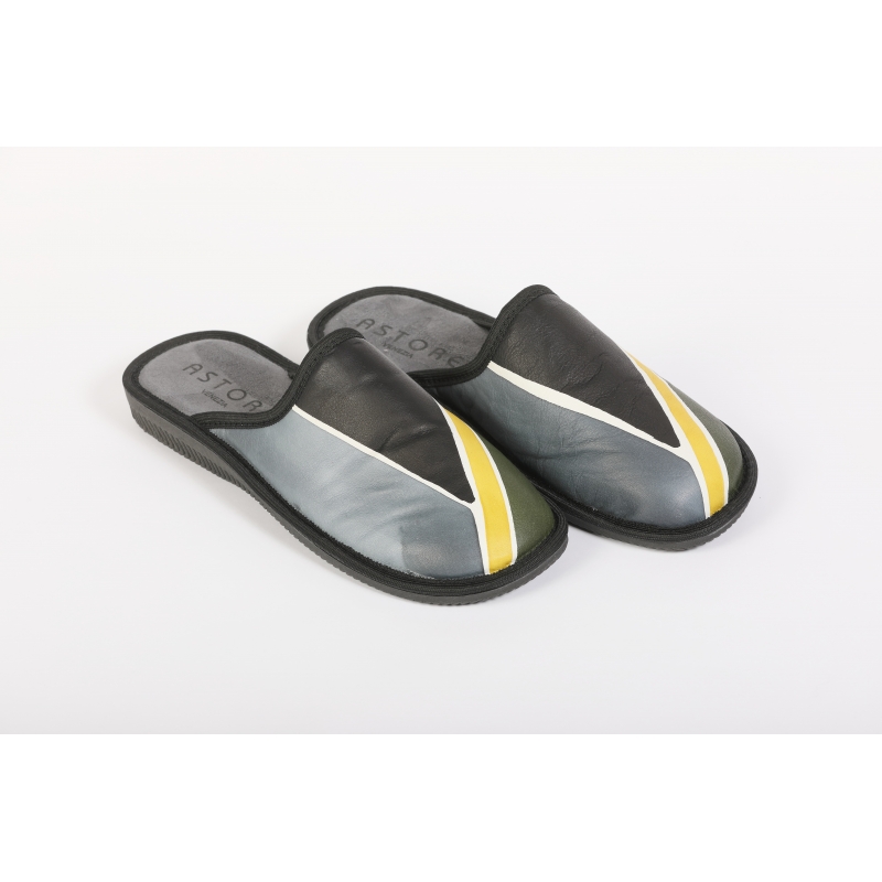 Ciabatte invernali da camera da uomo realizzate in pelle dipinta a mano, con interno in pelle e panno e suola in gomma. Sono morbide, comode e confortevoli, ottime anche come idea regalo. Colori grigio, verde, nero e giallo e motivo geometrico.