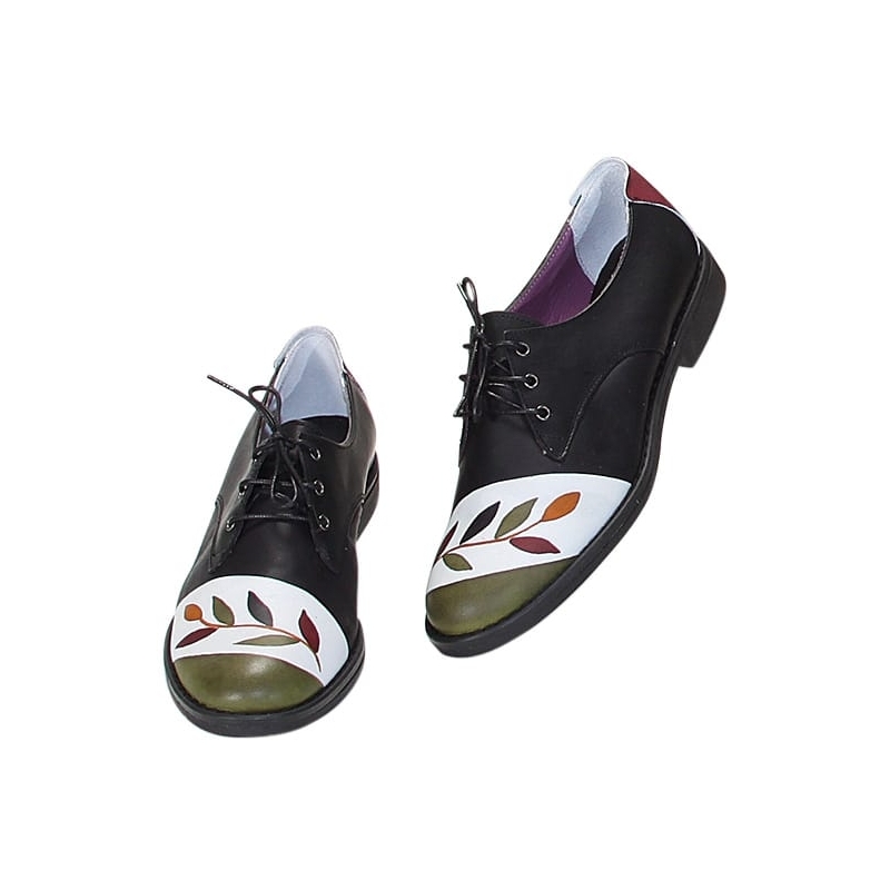 Scarpe in pelle dipinta a mano con lacci. Ideali per tutte le occasioni, anche quelle più formali. Da abbinare alla tua borsa Acquerello! Colori nero, verde, giallo e bordeaux e motivo ramo.